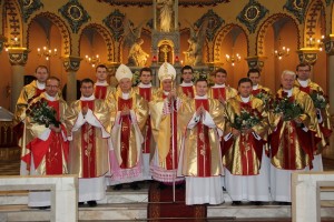 Ks. biskup Edward Janiak prosił o modlitwę za Ojca Świętego Franciszka, który jest namiestnikiem Chrystusa kierującym Kościołem. – Łączmy się z nim duchowo, identyfikując się w jego nauczaniu, postawie i świadectwie służbie Kościołowi oraz Chrystusowi – powiedział na początku Mszy św. ordynariusz diecezji kaliskiej. W homilii biskup kaliski wskazał na patronów: św. Piotra i św. Pawła. Wytłumaczył, że obu apostołów wspomina się w jednym dniu dla podkreślenia, że byli współzałożycielami gminy chrześcijańskiej w Rzymie, w tym mieście oddali za wiarę swoje życie i w tym samym dniu ponieśli śmierć męczeńską. Zachęcał diakonów, aby wśród świętych szukali przykładów do naśladowania. – Macie stać się sługami wybranymi przez samego Jezusa Chrystusa. Zaprośmy na naszą uroczystość znanych diakonów i zapytajmy jak służyć w tej służbie? – mówił ks. biskup, wskazując na diakona pierwotnego Kościoła św. Szczepana, który miał wielkie serce i wielki umysł, co bardzo przydało mu się do służby. Wśród świętych zauważył diakona św. Wawrzyńca, który rozdał majątek ubogim. Za wzór do naśladowania postawił diakonom św. apostołów Piotra i Pawła, a także św. Józefa, który jest opiekunem Kościoła. Podkreślił jednak, że w centrum chrześcijańskiego powołania jest Jezus Chrystus, o którym nigdy nie można zapomnieć. Przed zakończeniem Eucharystii biskup kaliski modlił się o powołania do kapłaństwa. – Dzisiaj świat jest bardzo laicki. Nie jest łatwo iść dzisiaj do świata w imię Jezusa Chrystusa z Ewangelią, dlatego bardzo proszę wszystkich o modlitwę w intencji powołań. Teraz przed obliczem Matki Najświętszej Królowej Apostołów wspólną modlitwą wypraszajmy powołania do kapłaństwa – prosił ks. biskup Edward Janiak. W uroczystości uczestniczyli, m.in. ks. biskup senior Teofil Wilski, ks. prałat Tomasz Ilski, proboszcz Konkatedry, ks. kanonik Jan Grzeszczak, rektor Wyższego Seminarium Duchownego w Kaliszu, moderatorzy, wykładowcy, klerycy, krewni diakonów. Uroczystość uświetniła schola seminaryjna.