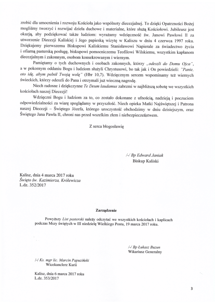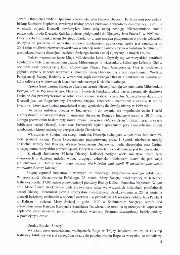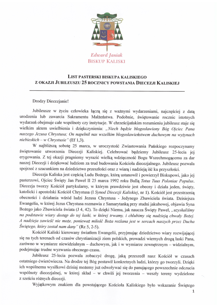 List Biskupa Kaliskiego z okazji 25. rocznicy powstania diecezji