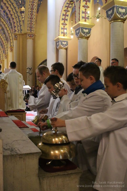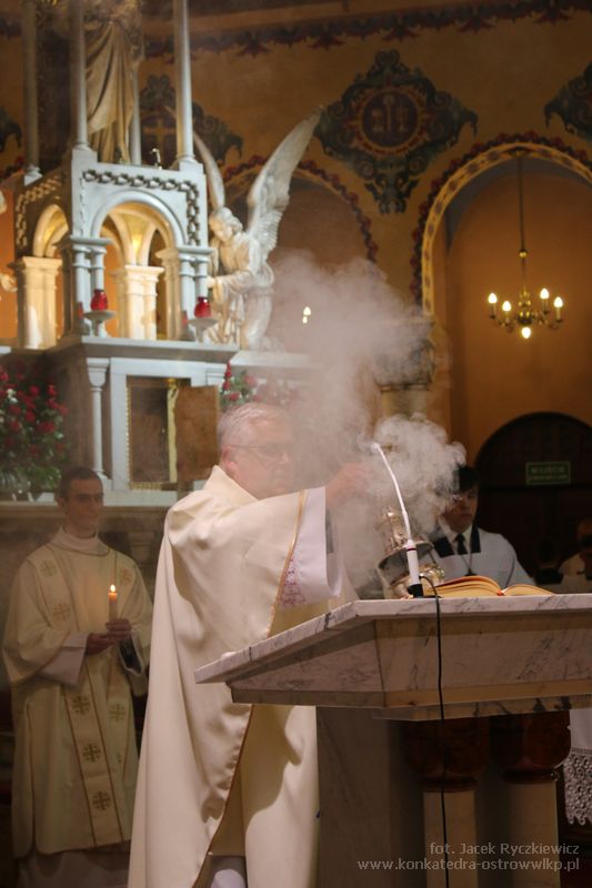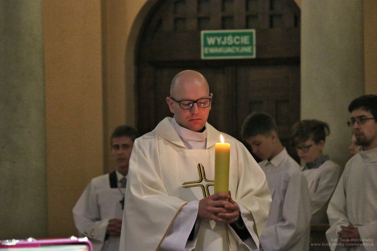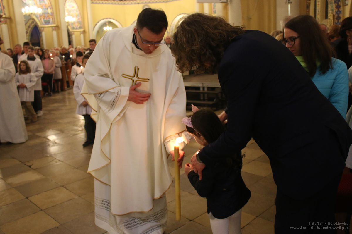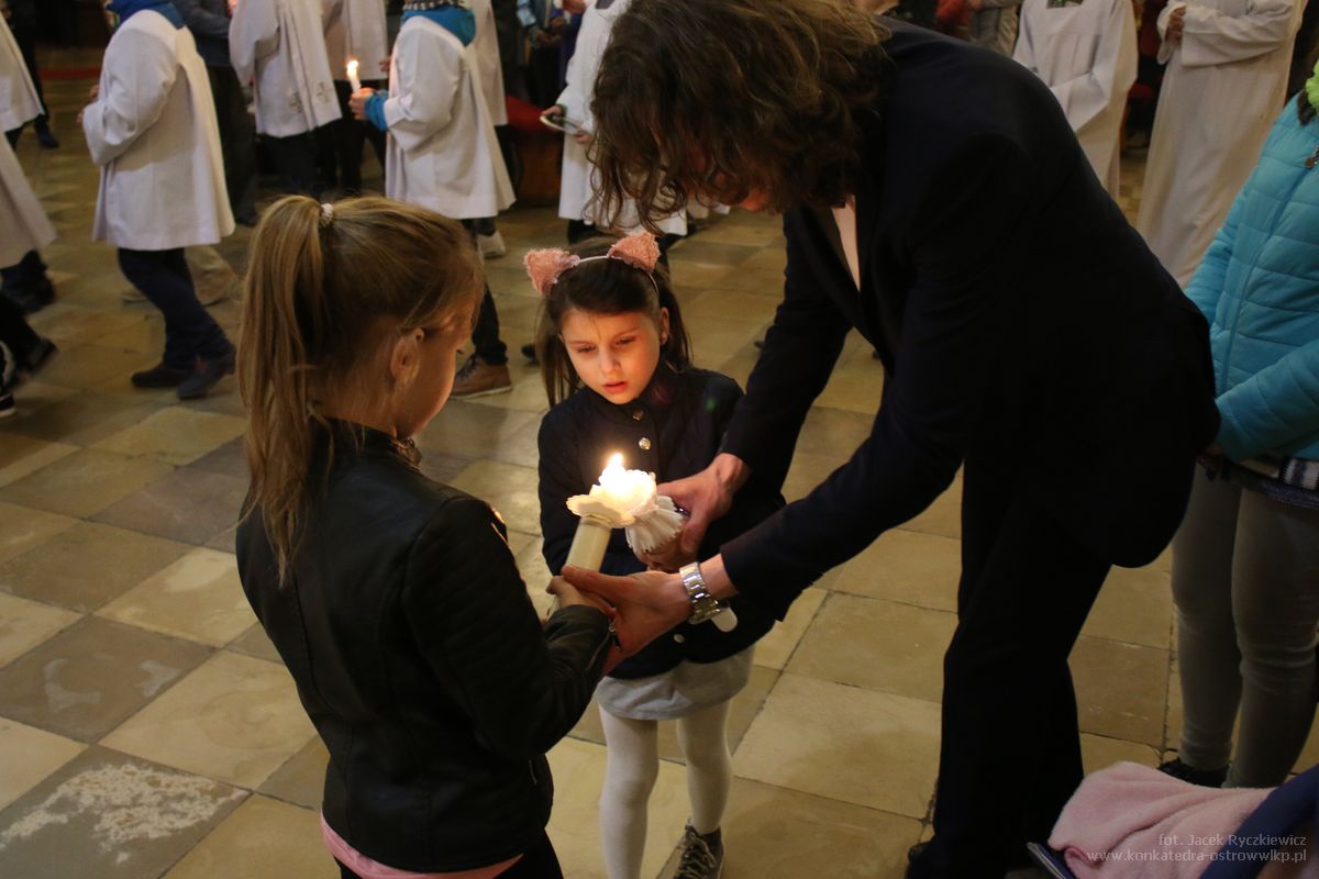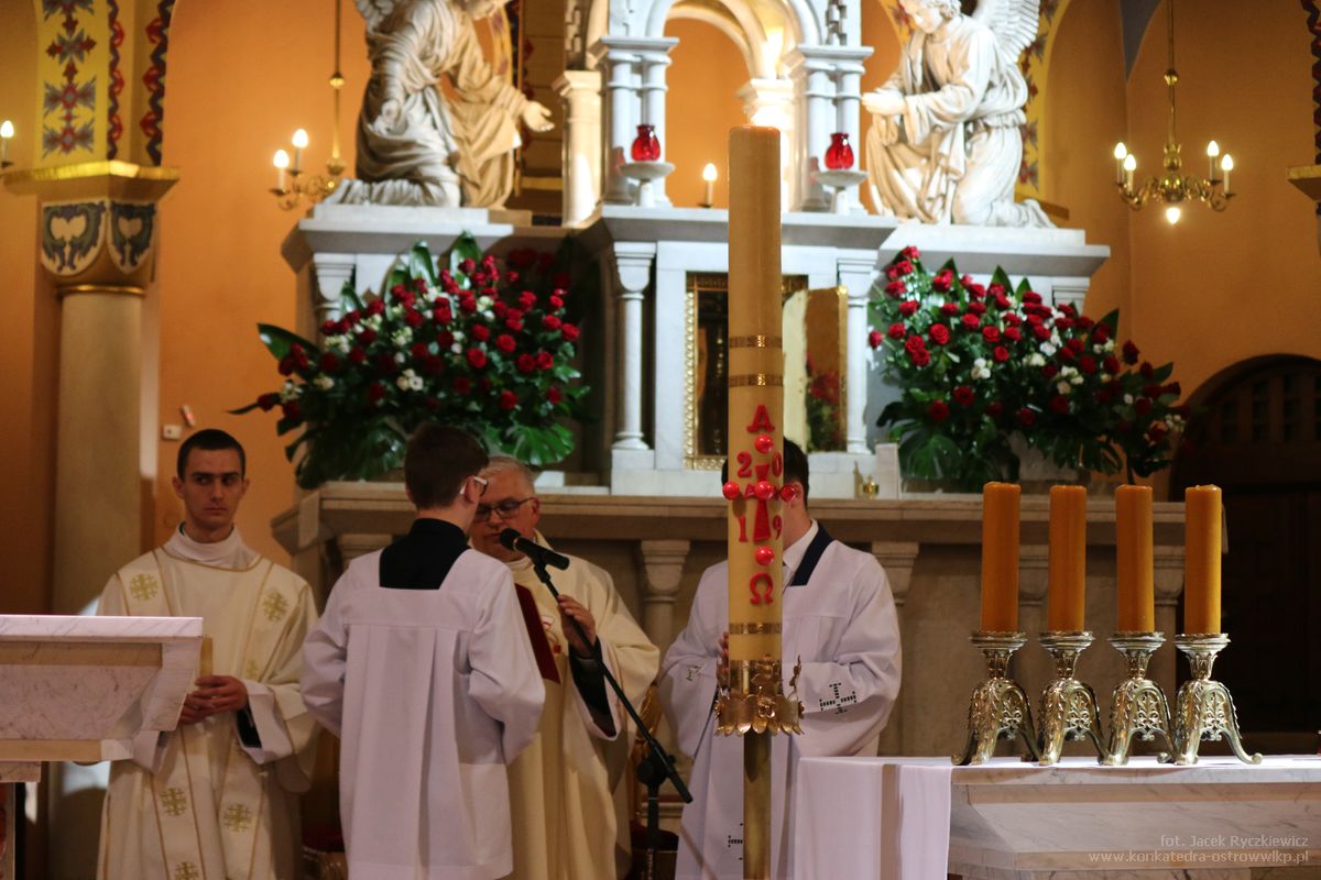 Uroczystość rozpoczęła się po zachodzie słońca od liturgii światła. Na zewnątrz Konkatedry celebrans poświęcił ogień. – Chrystus wczoraj i dziś, początek i koniec, Alfa i Omega. Do Niego należy czas i wieczność, Jemu chwała i panowanie przez wszystkie wieki wieków. Amen – powiedział ks. Proboszcz żłobiąc znak krzyża na Paschale – symbolu zmartwychwstałego Chrystusa. Umieszczone na nim zostało pięć ozdobnych czerwonych gwoździ, symbolizujących rany Chrystusa oraz aktualny rok. Paschał został odpalony od ognia i wniesiony do okrytej mrokiem Konkatedry,  gdzie wierni odpalili od niego swoje świece, przekazując sobie wzajemnie światło. Po dojściu kapłana do prezbiterium i wypowiedzeniu po raz trzeci słów: „Światło Chrystusa. W. Bogu niech będą dzięki” w świątyni zostało zapalone oświetlenie. Zwieńczeniem obrzędu światła była uroczysta pieśń (Pochwała Paschału) – Exultet, która zaczyna się od słów: „Weselcie się już zastępy Aniołów w niebie! Weselcie się słudzy Boga! Niech zabrzmią dzwony głoszące zbawienie, gdy Król tak wielki odnosi zwycięstwo!”.