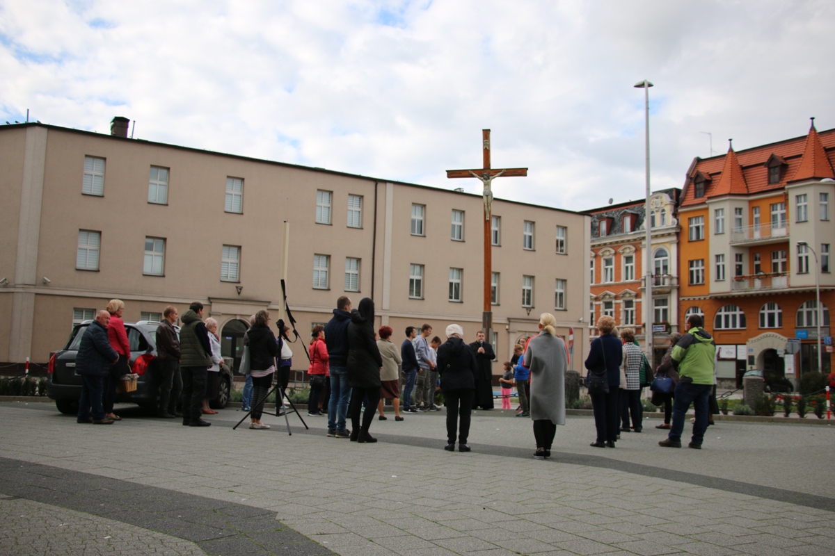 Kilkadziesiąt osób zgromadziło się przy krzyżu przed Konkatedrą, by modlić się Koronką do Bożego Miłosierdzia w ulicznym zgiełku. Nabożeństwo poprowadził ks. diakon Mateusz Paprocki. Do wspólnej modlitwy dołączyły dzieci ze świetlicy Boże Podwórko.