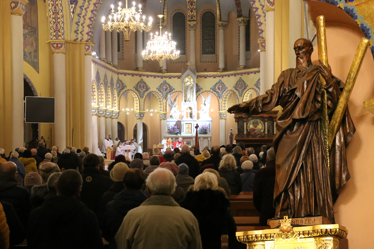 W homilii ks. Będzieszak powiedział, że Chrystus poprzez postać św. Andrzeja chce wkroczyć w ludzką codzienność. Zachęcał wiernych do przyjęcia Jezusa w swoim życiu, który chce być w nim obecny. – Mogę wliczyć Boga w moje codzienne sprawy, jako siłę realną, prawdziwą moc. Świadomość bliskości Jezusa pozwoli mi oceniać zwykłe wydarzenia z wielkiej perspektywy nieba, czyli Bożej miłości – podkreślił kapłan. Zaznaczył, że Bóg patrzy na każdego człowieka, a to spojrzenie to miłość i powołanie. Człowiek jednak może Mu na to odpowiedzieć wiarą lub obojętnością. – Św. Andrzej to dobry patron na dzisiejsze czasy, bo jego postawa przypomina, że można odpowiedzieć postawą wiary i wędrówką za Jezusem – stwierdził celebrans. Kapłan wskazał na odkrycie papieża Benedykta XVI, który zauważył, że rodzice św. Andrzeja nadali mu imię greckie, a nie hebrajskie, co świadczy o wielkiej otwartości tej rodziny na innych ludzi i na inne kultury. Wskazał, że św. Andrzej miał wielki szacunek dla innych oraz był dla nich misjonarzem. – Św. Andrzej przyprowadził do Jezusa nie tylko swojego brata, Piotra, ale także w innym fragmencie Ewangelii wyczytamy, że przyprowadził Greków, którzy bardzo chcieli Jezusa zobaczyć. Być może im tłumaczył z greckiego. Więc prawdziwa chrześcijańska otwartość to szacunek dla innych, to takie poczucie bycia misjonarzem, ja jestem chrześcijaninem i chcę, aby inni poznali Jezusa. Bo Jezus to nie jeden z wielu nauczycieli, to nie jedna z wielu możliwych dróg do wybierania, to Syn Boży, Zbawiciel. Nie znać Go, to ciągle szukać i ciągle błądzić, to mieć pytania a nie otrzymywać odpowiedzi. Jezus jest odpowiedzią – powiedział ks. Michał. Wskazał, że Kościół jest prawdziwym miejscem, gdzie człowiek jest otwarty dla każdego człowieka z różnych kultur. Zachęcał, by nie ulegać fałszywym poglądom na temat wiary i nauki. – Warto prosić św. Andrzeja, by wzbudził w nas szacunek do tego, co nas prowadzi do Jezusa. Co nas prowadzi do Boga, a przez to do prawdy i zbawienia. Byśmy mieli odwagę i chęć wkładania wysiłku w zrozumienie naszej wiary i odkrywania jej rozumności. Wielkiego mamy patrona apostoła, wielkiego przewodnika – mówił ks. Dyrektor.
