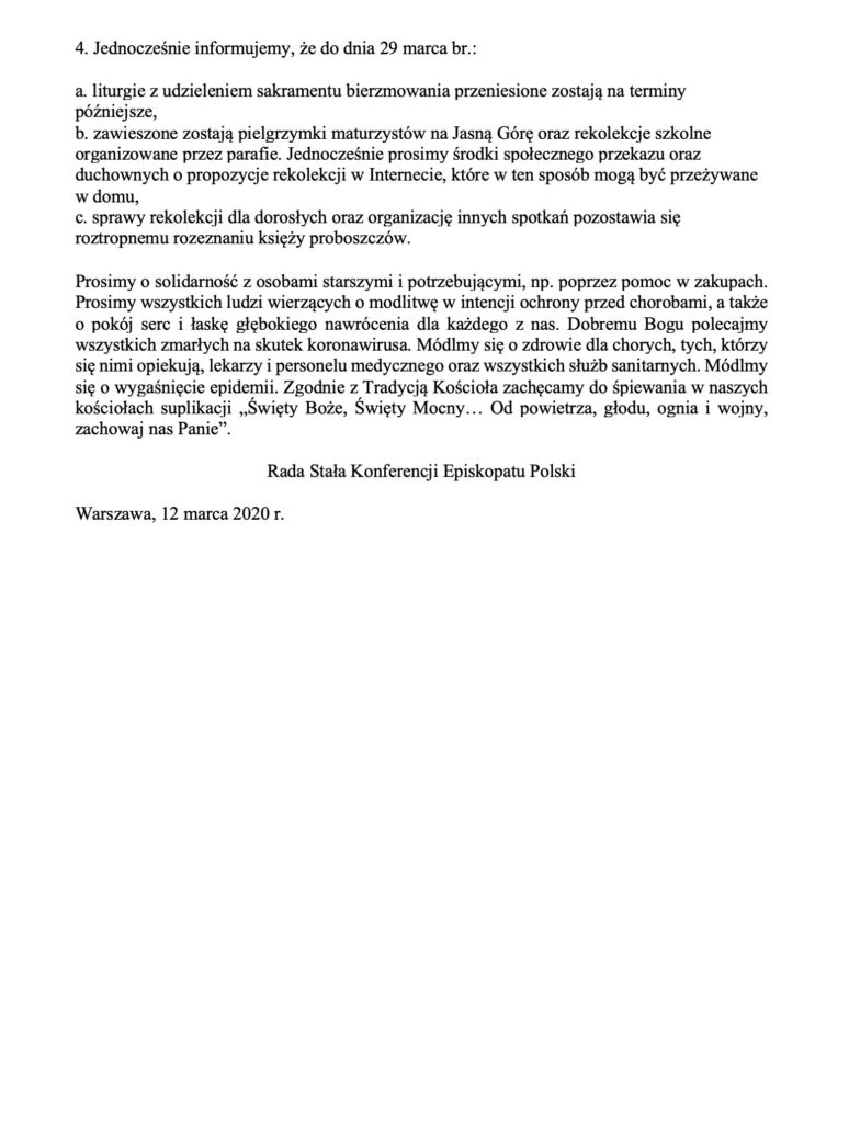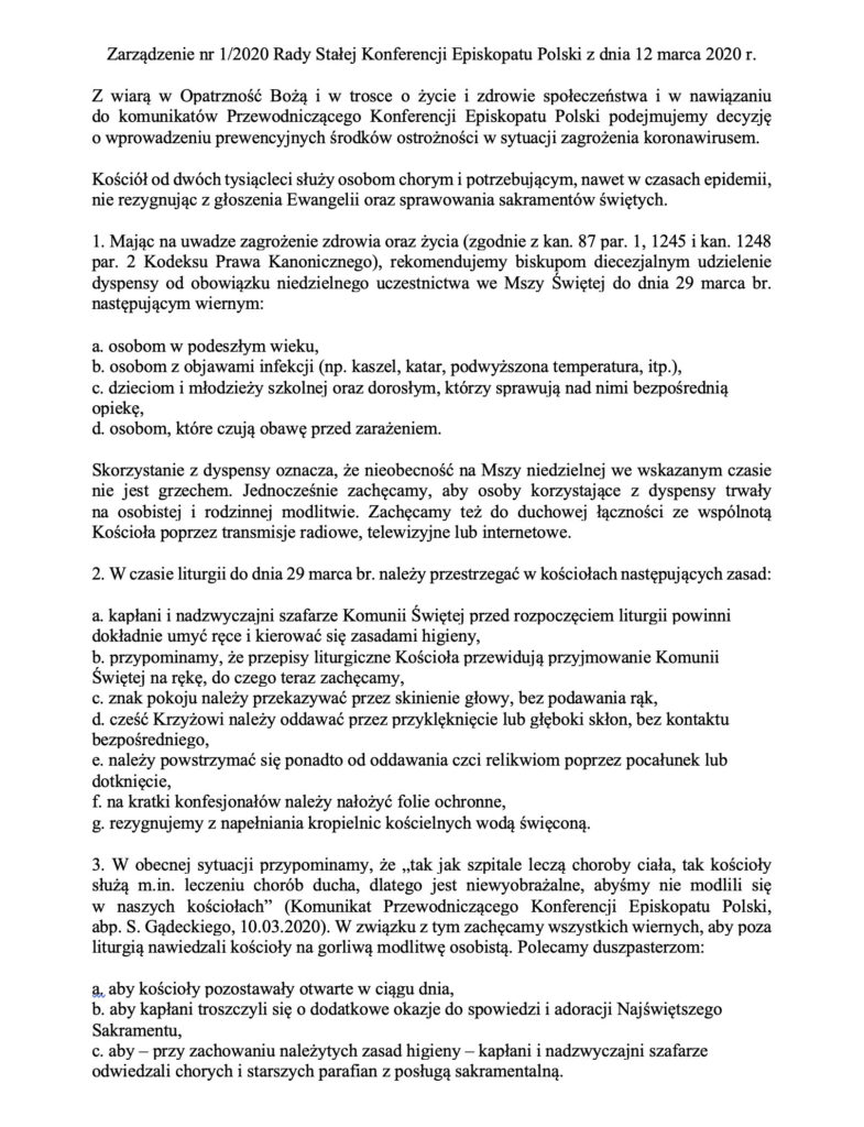 1. Mając na uwadze zagrożenie zdrowia oraz życia (zgodnie z kan. 87 § 1, kan. 1245 i kan. 1248 § 2 Kodeksu Prawa Kanonicznego), rekomendujemy biskupom diecezjalnym udzielenie dyspensy od obowiązku niedzielnego uczestnictwa we Mszy Świętej do dnia 29 marca br. następującym wiernym: