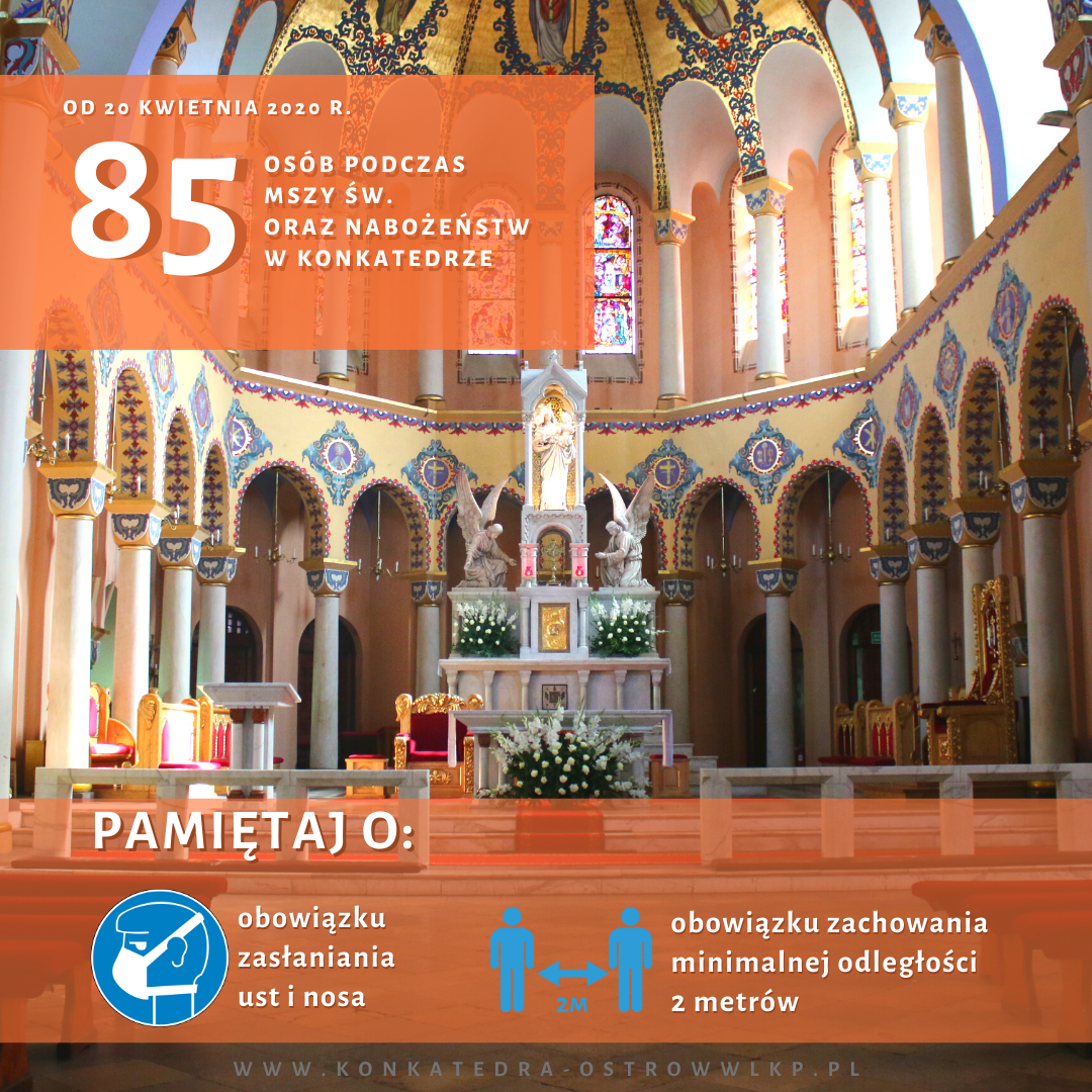 Od poniedziałku 20 kwietnia 2020 r. podczas każdej Mszy św. i nabożeństw wewnątrz Konkatedry będzie mogło przebywać 85 osób.