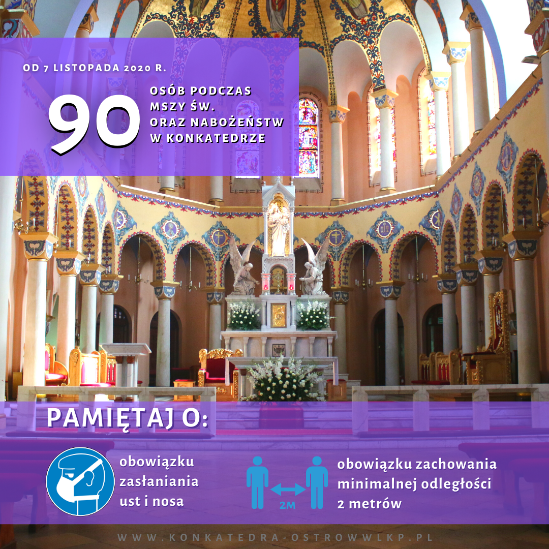 Nowy limit obowiązywać będzie od soboty 7 listopada 2020 r., a wynosić będzie 1 osobę/15 mkw. W związku z tym w konkatedrze jednocześnie uczestniczyć będzie mogło 90 osób.