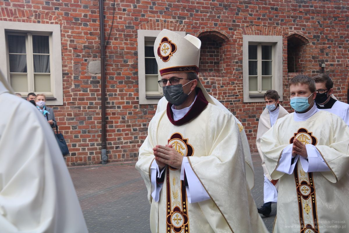 W drzwiach katedry bp Damian Bryl otrzymał od abp. Grzegorza Rysia krzyż do ucałowania, a następnie biskup kaliski pokropił zgromadzonych wodą święconą.