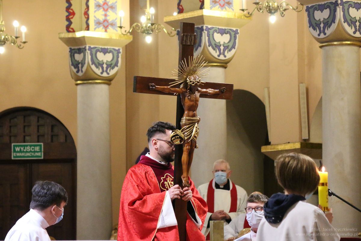 Wielki Piątek to przede wszystkim liturgia Krzyża. Wszystko rozpoczęło się od procesyjnego wejścia w ciszy celebransa ks. Jakuba Karpisiewicza, który przed ołtarzem położył się twarzą do podłogi, po czym nastąpiła dłuższa chwila milczenia i modlitwy. W Liturgii Słowa centrum stanowiło uroczyste czytanie Męki Pańskiej. Po homilii nastąpiła adoracja krzyża. Od Wielkiego Piątku aż do Wigilii Paschalnej przyklęka się przed krzyżem, oddając Mu cześć. Po adoracji nastąpiła Komunia św., po której Najświętszy Sakrament został przeniesiony do grobu. Tam, po krótkiej modlitwie, rozpoczęła się adoracja trwająca do późnych godzin wieczornych (z całodobową transmisją online) i w sobotę od świtu do rozpoczęcia Liturgii Wigilii Paschalnej.