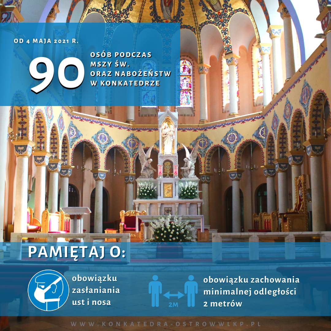 Nowy limit obowiązywać będzie od wtorku 4 maja 2021 r., a wynosić będzie 1 osobę/15 mkw. W związku z tym w konkatedrze jednocześnie uczestniczyć będzie mogło 90 osób.