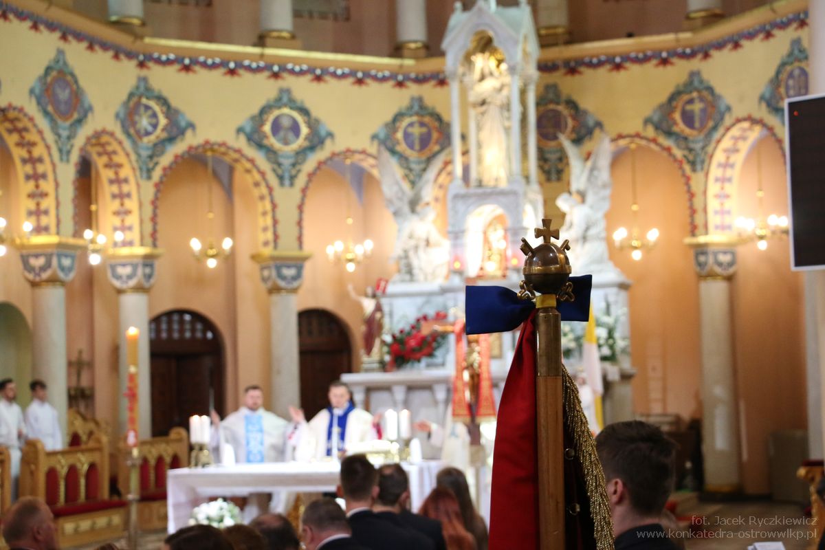 – Gromadzimy się tutaj dzisiaj w naszej ostrowskiej świątyni, w Konkatedrze, jako synowie i córki polskiej ziemi, ale przede wszystkim gromadzimy się tutaj dzisiaj wszyscy, jako dzieci dobrego i miłosiernego Boga, w tym kontekście historycznym, kiedy przeżywamy 231. rocznicę uchwalenia przez Sejm Czteroletni Konstytucji 3 Maja – mówił podczas homilii ks. wikariusz Krzysztof Raj. Kapłan podkreślał, że w roku przeżywamy kilkanaście świąt religijnych i państwowych, ale zadaniem każdego Polaka jest pielęgnowanie polskości każdego dnia. – Zadanie, które jest postawione przez dobrego Boga przed każdym z nas: Polskość i bycie Polakiem. To nie tylko przez rocznice, to nie tylko słowa pamiętam, ale to przede wszystkim codzienna ciężka praca, którą każdy dla dobra wspólnego, dla Ojczyzny stara się jak najlepiej wykonywać. Czy to w swoim miejscu pracy czy to poprzez wychowanie kolejnego pokolenia – mówił ks. Krzysztof. Zwrócił się również do przedstawicieli władz, podkreślając, że ich praca to przede wszystkim służba narodowi. – Posługa władzy, ci którzy ją piastują na różnego rodzaju szczeblach dobrze o tym wiedzą, zdają sobie z tego sprawę, że władza to przede wszystkim służba. To trudne decyzje, które trzeba często podejmować dla dobra nas wszystkich, chociażby w kontekście pandemii i wojny, która toczy się u naszych wschodnich granic, tej barbarzyńskiej wojny – zaznaczył ks. Raj. Podkreślał, że Maryja jest wzorem do naśladowania. – Maryja jest wzorem do naśladowania dla każdego z nas. To królowanie Maryi wyraża się przede wszystkim w jej posłudze względem małego Jezusa, którego piastowała. To królowanie Maryi wyraża się w posłudze względem św. Józefa, jej małżonka. To królowanie Maryi wyraża się w stosunku do Elżbiety, do której idzie żeby jej usługiwać, gdy ta jest w stanie błogosławionym – mówił dodając, że rolą każdego człowieka jest służenie drugiemu. – Służyć tak jak Maryja, drugiemu człowiekowi, szczególnie tym, których Pan Bóg stawia tak blisko, obok nas czy to w naszych rodzinach, czy to w miejscach pracy, w naszych szkołach, naszych małych ojczyznach, ale także i w tej naszej ukochanej Ojczyźnie, Polsce – zaznaczył ks. Raj. Zachęcał zgromadzonych by nie tylko pamiętali o ważnych wydarzeniach z przeszłości, ale również tą pamięć wyrażali w służbie do drugiego człowieka, Ojczyzny i Boga.