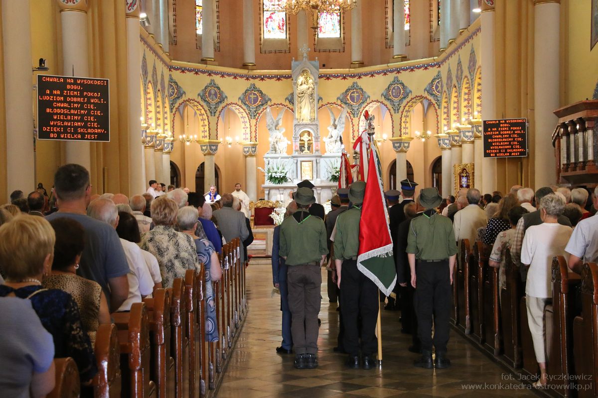 W homilii Proboszcz Ostrowskiej Konkatedry posłużył się wierszem z okazji święta Wojska Polskiego. – „(…) dawaj Anton, dawaj Iwan uchadim bystrieje / niosło się po polu w Armii Budionnego / w podziw wpadają ludzie – a któż tak szaleje? / to uderzyła konnica Generała Rydza-Śmigłego / wnet poszli jak burza sam Naczelnik prowadził / pognali psubratów, Polskę mamy wolną! / dzień Wojska Polskiego Sejm nowy uchwalił / piętnastego sierpnia w Dzień Cudu nad Wisłą!” – mówił ks. Adam. Kapłan podkreślał, że walczący nie ustawali w modlitwie. – Warszawiacy, którzy w czasie bitwy nie ustawali w modlitwie, na wieść o zwycięstwie dziękowali Bogu za interwencję z Nieba. 15 sierpnia 1920 r., w dzień Wniebowzięcia Najświętszej Maryi Panny – zaznaczył. Kapłan nawiązał również do dnia dzisiejszego, kiedy to przy naszej granicy trwa zbrojna napaść Rosyjskiego agresora na Ukrainę. – Przeżywamy po latach znów wojnę. Tak blisko naszych granic. Codziennie ginie tylu niewinnych ludzi: mężczyźni, kobiety, dzieci. Dlaczego tak jest?! – zastanawiał się ks. Kosmała szukając odpowiedzi w Piśmie Świętym. – A co Jezus mówił o pokoju: Choćby w Ewangelii wg. Św. Jana rozdział 14 czytamy: „Pokój zostawiam wam, pokój mój daję wam. Nie tak jak daje świat, Ja wam daję. Niech się nie trwoży serce wasze ani się nie lęka. Wierzycie w Boga i we Mnie wierzcie. Ja jestem drogą i prawdą i życiem” – mówił ks. Adam. – Tylko Bóg może dać nam pokój. Niech Bóg błogosławi wojska, które bronią pokoju. Niech Maryja ma nas wszystkich w Opiece. Śpiewajmy zawsze z mocną wiarą: Boże coś Polskę, przez tak liczne wieki… Zdrowaś Maryjo Bogarodzico, Błagamy Ciebie, święta Dziewico – zakończył ks. Adam.