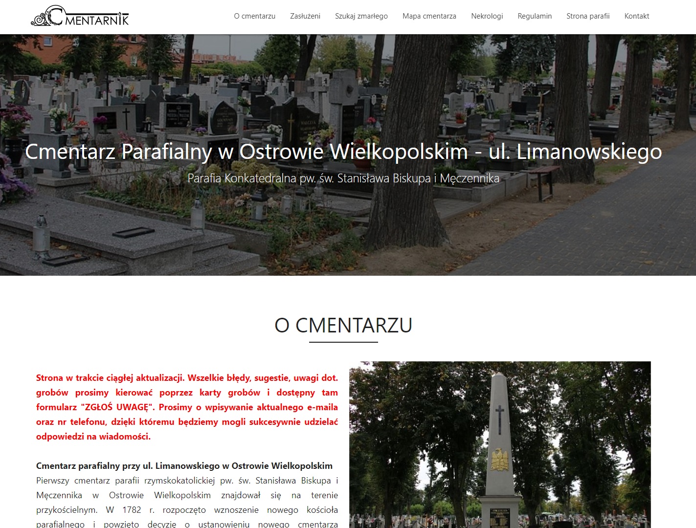 Po kilku miesiącach prac nad inwentaryzacją cmentarza parafialnego przy ul. Limanowskiego w Ostrowie Wielkopolskim oraz przeniesienia również w przestrzeń wirtualną udostępniamy portal cmentarny. Przy bramach pojawiły się plany cmentarza z podziałem na sektory. Każdy sektor otrzymał również tablicę z planem i kodem QR, który po zeskanowaniu telefonem przeniesie bezpośrednio do danego sektora, gdzie odnaleźć można zmarłych spoczywających na cmentarzu.
