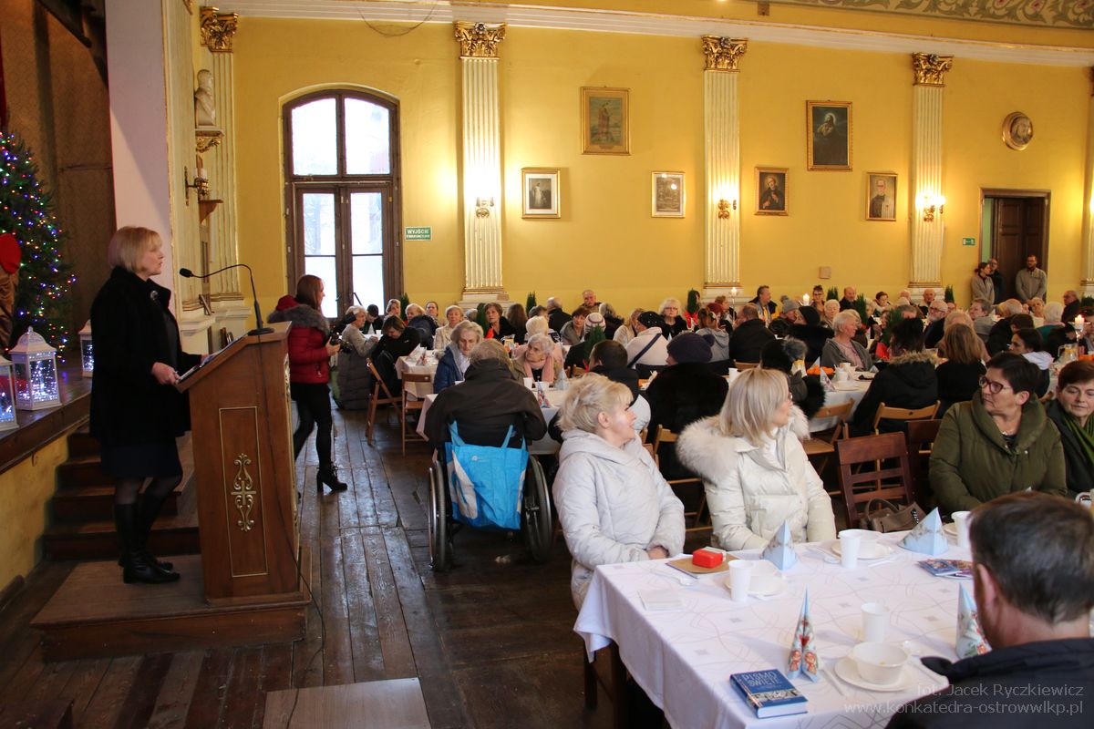 Na początku spotkania głos zabrała Przewodnicząca Stowarzyszenia Konferencji św. Wincentego a Paulo Irena Dutkowska, która powitała zgromadzonych w dużej sali Domu Katolickiego. Następnie głos zabrała terapeutka Daria Ciesielska, która podsumowała akcję „W zdrowym ciele zdrowy duch”. Po odczytaniu fragmentu Ewangelii przez ks. Proboszcza Adama Kosmałę życzenia świąteczne złożył wiceprezydent Ostrowa Wielkopolskiego Sebastian Górski. – Dla was i waszych bliskich życzę zdrowia i jak najwięcej powodów do uśmiechu na co dzień, nie tylko od święta. Wszystkiego dobre – życzył. – Ja obiecuję modlitwę w waszej intencji, was proszę o modlitwę i życzę wam zdrowych, spokojnych, pełnych pokoju świąt Bożego Narodzenia – życzył natomiast proboszcz Konkatedry ks. kan. Adam Kosmała, który podkreślał w życzeniach jak ważny jest pokój w dzisiejszym świecie, gdzie przy granicy kraju panuje wojna. W trakcie spotkania wystąpiły dzieci z Bożego Podwórka – świetlicy prowadzonej przez Stowarzyszenie Konferencji św. Wincentego a Paulo.