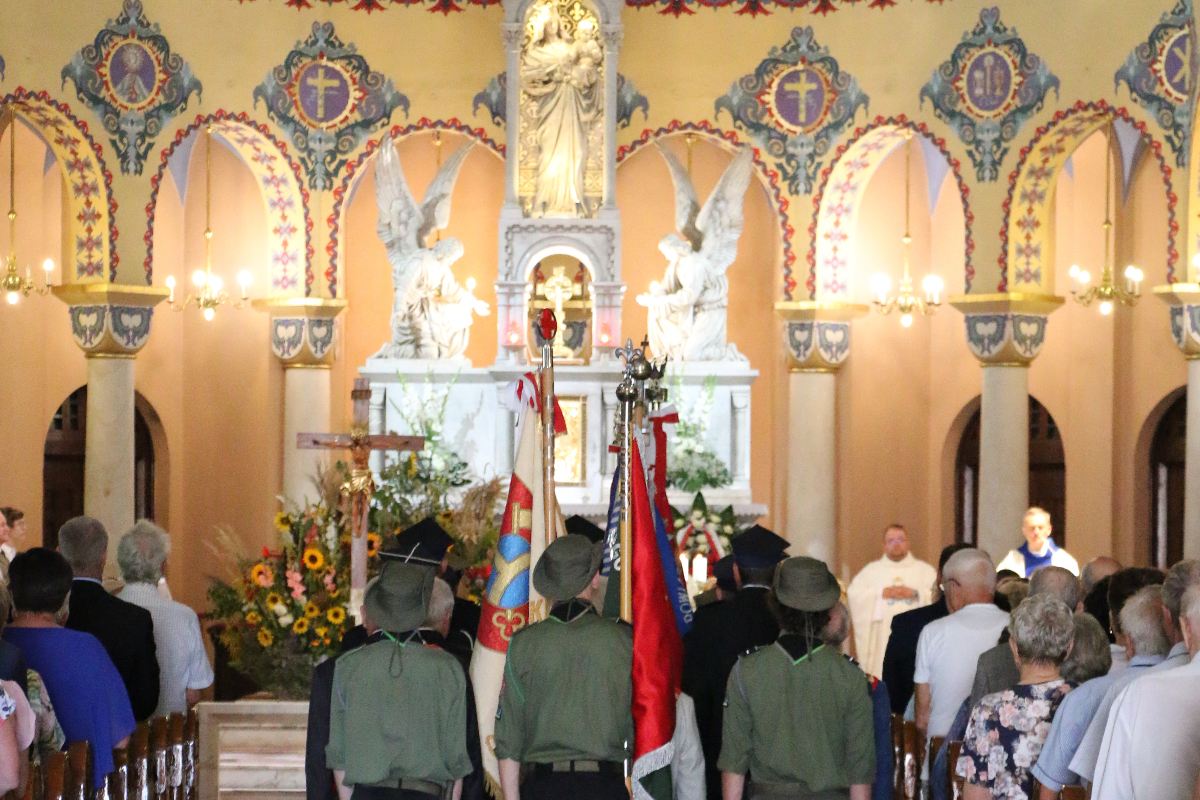– Wspominamy wydarzenia z 1920 roku. Ogromne zagrożenie ze wschodu nie tylko dla Polski, ale i dla Europy. Nastąpiła niezwykła mobilizacja narodowa, wojskowa, patriotyczna. Połączone zostały oddziały naczelnika Piłsudskiego, wojsk gen. Hallera i Armii Wielkopolskiej z gen. Dowbor-Muśnickim. Była wzorowa współpraca naczelnego wodza z szefem sztabu gen. Rozwadowskim – mówił podczas homilii ks. Eugeniusz Krawczyk. Kapłan zauważył, że pomimo różnych poglądów potrafili się zjednoczyć. Przypomniał, że wówczas w całym kraju nie ustawały modlitwy we wszystkich kościołach i na Jasnej Górze. – Ranni wzięci do niewoli sowieccy żołnierze zeznali, że nagle ujrzeli na niebie potężną, pełną mocy kobiecą postać, od której biło jasne światło. Swoim płaszczem zasłaniała Warszawę, a od tarczy, którą trzymała w dłoni, odbijały się pociski wymierzone w Polaków i uderzały w pozycję Rosjan – mówił ks. Krawczyk. Wspomniał również, że w sierpniu wspomina się inne wydarzenie, które również zjednoczyło Polaków, stworzyło wspólnotę. Powstanie Warszawskie to według relacji jednej ze świadków również wspólnotowe działanie. – „Wtedy, najważniejsza była wspólnota. Czułam, że my Warszawiacy, Polacy jesteśmy razem, że działamy w jednej sprawie. To poczucie wspólnoty było niezwykłe niezapomniane jedyne w swoim rodzaju. I to jest największa wartość, najświętsza, którą niestety utraciliśmy w późniejszych latach. Ta umiejętność wspólnego działania dla dobra państwa, Ojczyzny, powrócenie do tego byłoby dla nas największą radością” – cytował kapłan zauważając, że jest to narodową słabością również w dzisiejszych czasach. Wspomniał św. Maksymiliana Marię Kolbę, który oddał życie za drugiego człowieka. Wspominając świętgo zaznaczył, że życie każdego człowieka jest drogą do chwały, która nie jest łatwa. – Papież Franciszek mówił do młodych czuwających i modlących się w Brzegach koło Wieliczki: „nie zabierzemy się do wykrzykiwania przeciw komuś, nie zaczniemy się kłócić, nie chcemy niszczyć. Nie chcemy pokonać nienawiści obelgami i jeszcze większą nienawiścią, przemocy większą przemocą, pokonać terroru jeszcze większym terrorem. A nasza odpowiedź na ten świat w stanie wojny ma imię: nazywa się przyjaźnią, nazywa się braterstwem, nazywa się komunią, nazywa się rodziną” – cytował ks. Eugeniusz.
