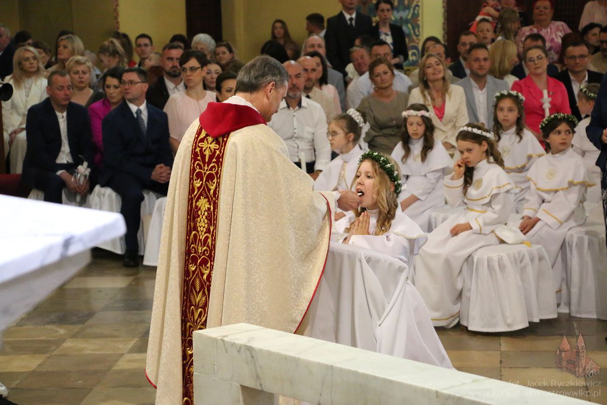– Pierwsza Komunia Święta to nie tylko piękna, ale i wzniosła uroczystość. Jest ona szczególna, ponieważ za chwilę przyjmiecie Pana Jezusa, co jest momentem duchowego wzmocnienia. Ewangelia na dzisiejszą niedzielę Trójcy Przenajświętszej przypomina nam o znaczeniu tej chwili. Bóg Ojciec, Syn Boży i Duch Święty, czyli Trójca Święta jest fundamentalnym elementem naszej wiary – mówił podczas homilii ks. Artur Zmyślony. Dzieci wskazały, że pierwszą modlitwą, której się nauczyli, była „W imię Ojca i Syna i Ducha Świętego” i znak krzyża. A to właśnie ten gest symbolizuje wiarę i jest wyrazem oddania się Bogu. Kapłan przypomniał zgromadzonym w świątyni, że krzyż przypomina o ofierze Jezusa i o tym, że wierzymy w jednego Boga w trzech osobach. – W dłoniach trzymacie świece, które symbolizują waszą wiarę. Te świece były zapalone podczas waszego chrztu, a teraz ponownie zostaną zapalone od paschału – symbolu Chrystusa zmartwychwstałego. Świece te symbolizują światło Chrystusa, które nosicie w swoich sercach – mówił ks. Artur. Zachęcał dzieci by zawsze starały się przyjmować Ciało Chrystusa. – Przyjęcie Komunii Świętej to nie tylko dzisiejszy moment, ale zobowiązanie na całe życie. Starajcie się zawsze przyjmować Jezusa do swojego serca, nawet jeśli popełnicie grzech. Pamiętajcie, że zawsze możecie się oczyścić przez spowiedź świętą i ponownie przyjmować Komunię Świętą – powiedział kapłan.
