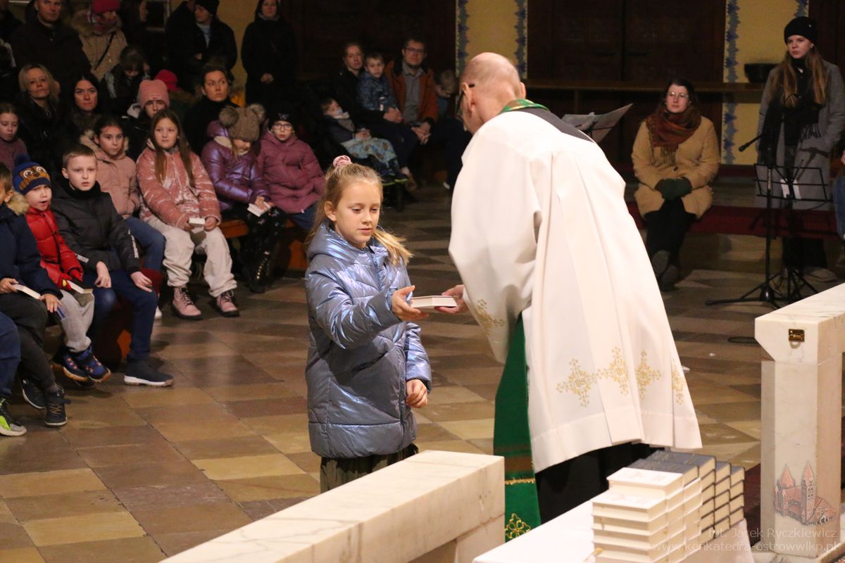 Poświęcone modlitewniki wręczył dzieciom, w imieniu ks. Proboszcza, ks. Dominik Wieczorek. Zgromadzeni w świątyni wspólnie modlili się o Boże błogosławieństwo dla dzieci, prosząc o potrzebne łaski w przygotowaniach do Pierwszej Komunii Świętej.