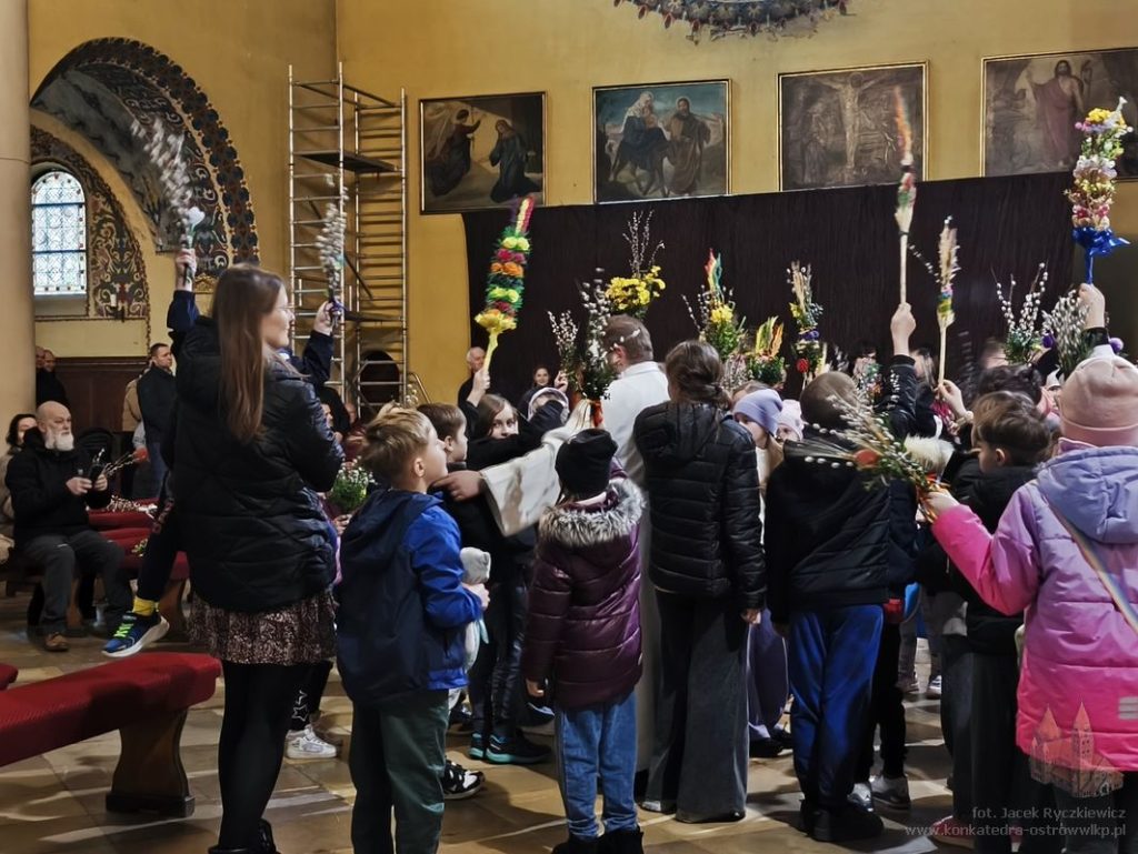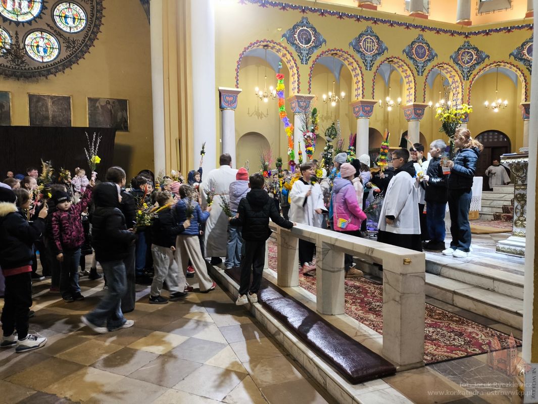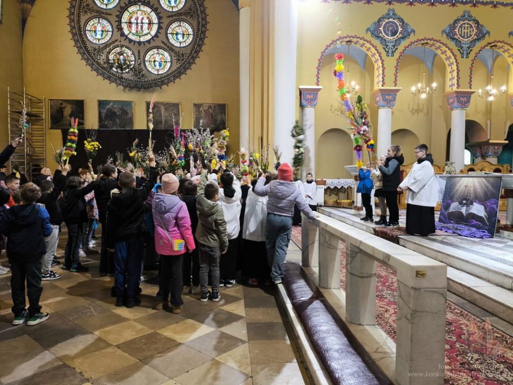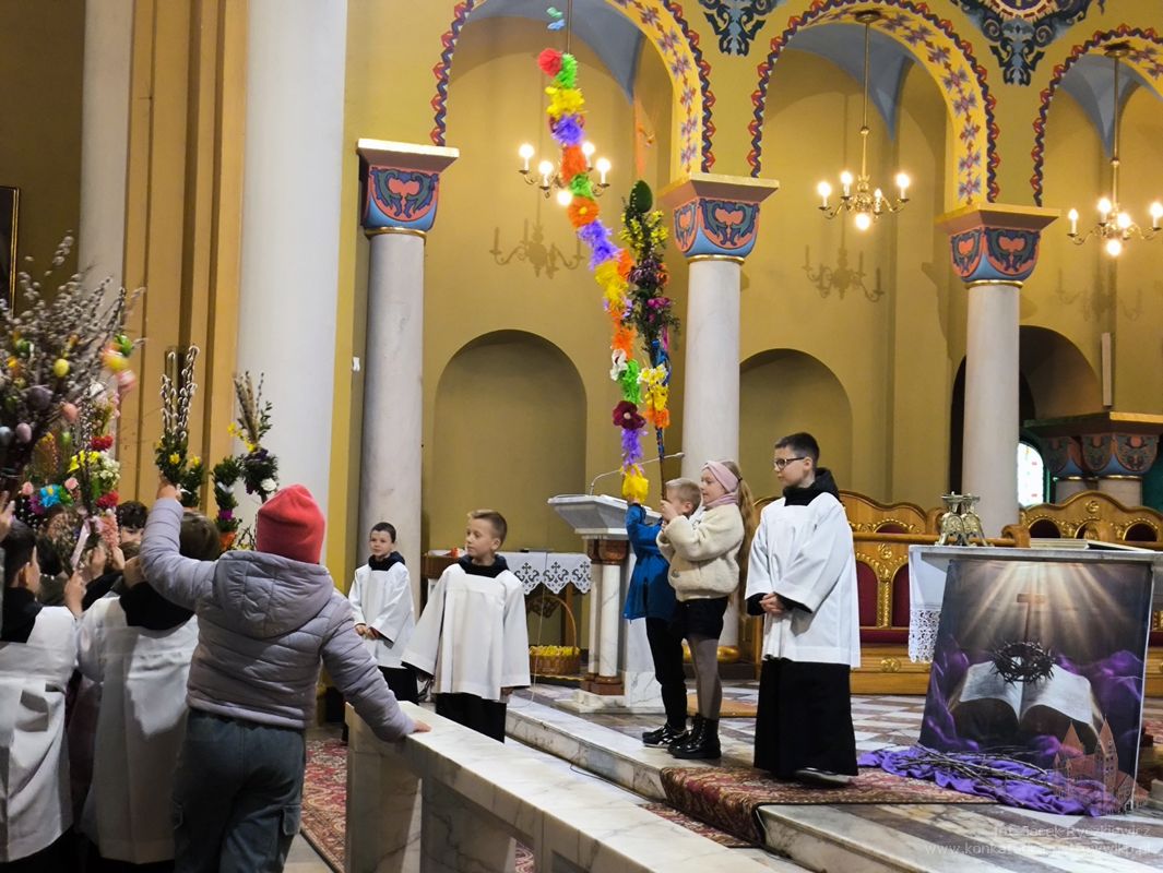 W Niedzielę Palmową dzieci pojawiły się w naszej świątyni z palmami, które wzięły udział w konkursie. Wśród palm wyraźnie dominowała jedna bardzo wysoka i okazała palma, wykonana na długim kiju i ozdobiona układającymi się kaskadowo, jaskrawymi różnokolorowymi kwiatami z bibuły. Pozostałe palmy miały bardziej naturalny charakter składających się głównie z wiosennych gałązek wierzbowych, zielonego bukszpanu oraz różnorodnych suszonych i barwionych traw, a także drobnych kwiatów. Ks. Artur wyróżnił kilkadziesiąt palm, ale każde dziecko otrzymało drobny słodki upominek.