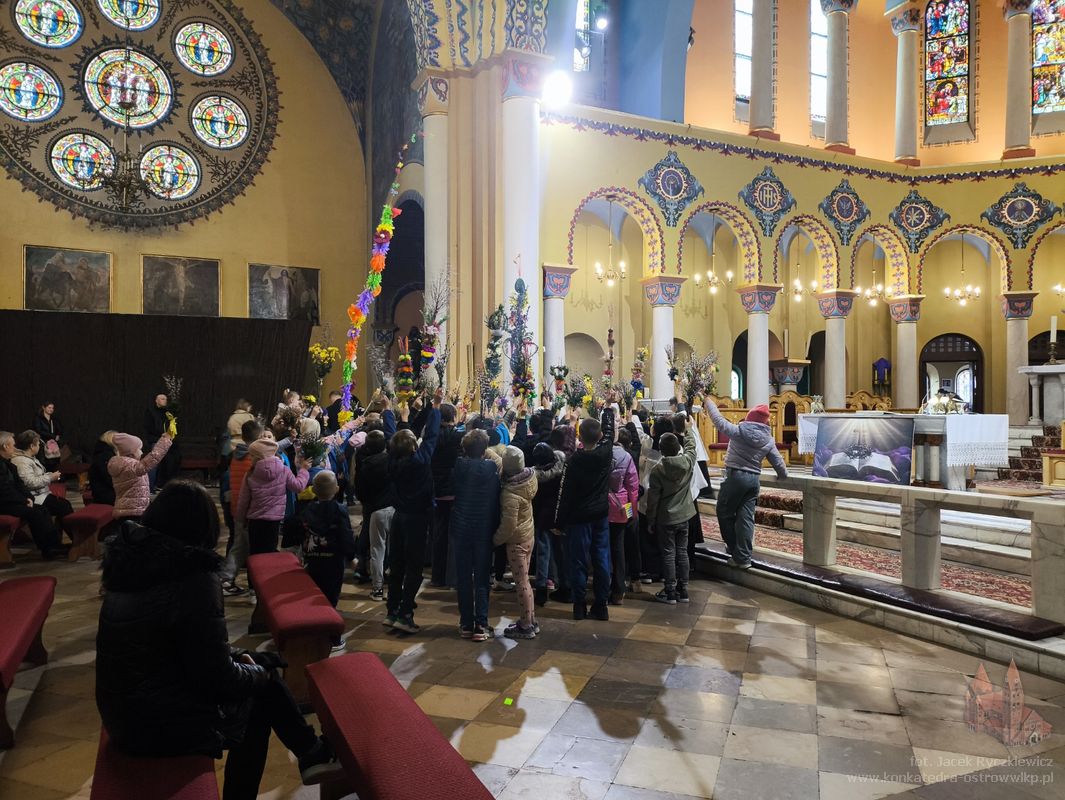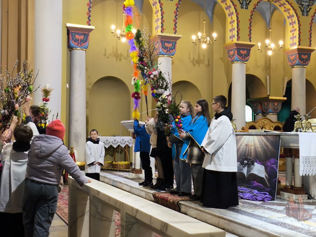 W Niedzielę Palmową dzieci pojawiły się w naszej świątyni z palmami, które wzięły udział w konkursie. Wśród palm wyraźnie dominowała jedna bardzo wysoka i okazała palma, wykonana na długim kiju i ozdobiona układającymi się kaskadowo, jaskrawymi różnokolorowymi kwiatami z bibuły. Pozostałe palmy miały bardziej naturalny charakter składających się głównie z wiosennych gałązek wierzbowych, zielonego bukszpanu oraz różnorodnych suszonych i barwionych traw, a także drobnych kwiatów. Ks. Artur wyróżnił kilkadziesiąt palm, ale każde dziecko otrzymało drobny słodki upominek.