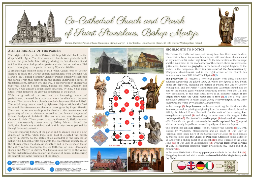 Welcome to the Co-Cathedral Church in Ostrów Wielkopolski. We invite you to explore the church using the prepared audio guide or to learn about its history and the most interesting architectural features presented in the illustration.