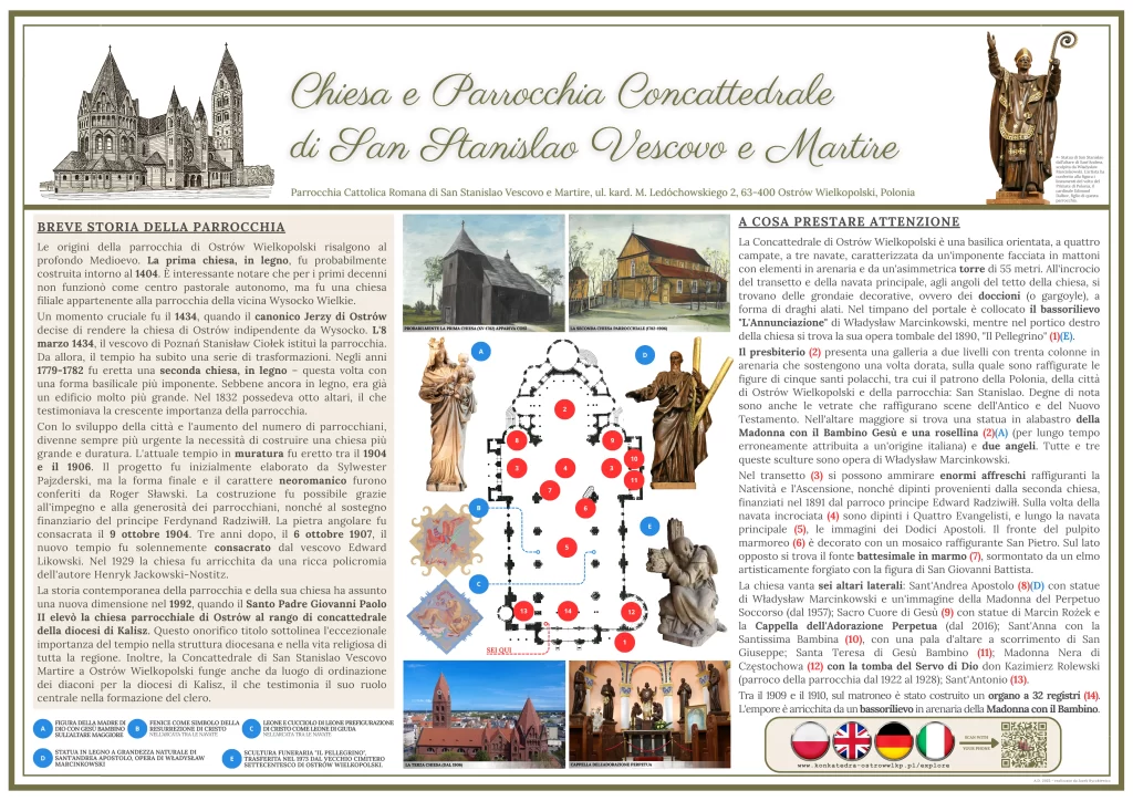 Benvenuti nella Concattedrale di Ostrów Wielkopolski. Vi invitiamo a visitare la chiesa con l’audioguida preparata o a conoscere la sua storia e gli elementi architettonici più interessanti illustrati nel grafico.