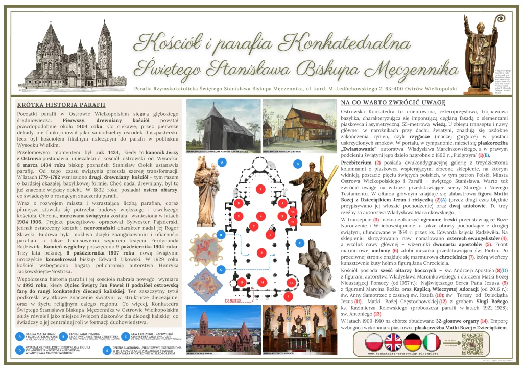 Witamy w Kościele Konkatedralnym w Ostrowie Wielkopolskim. Zachęcamy do zwiedzania świątyni z przygotowanym audioprzewodnikiem lub do zapoznania się z krótką historią i najciekawszymi elementami architektury przedstawionymi na grafice.